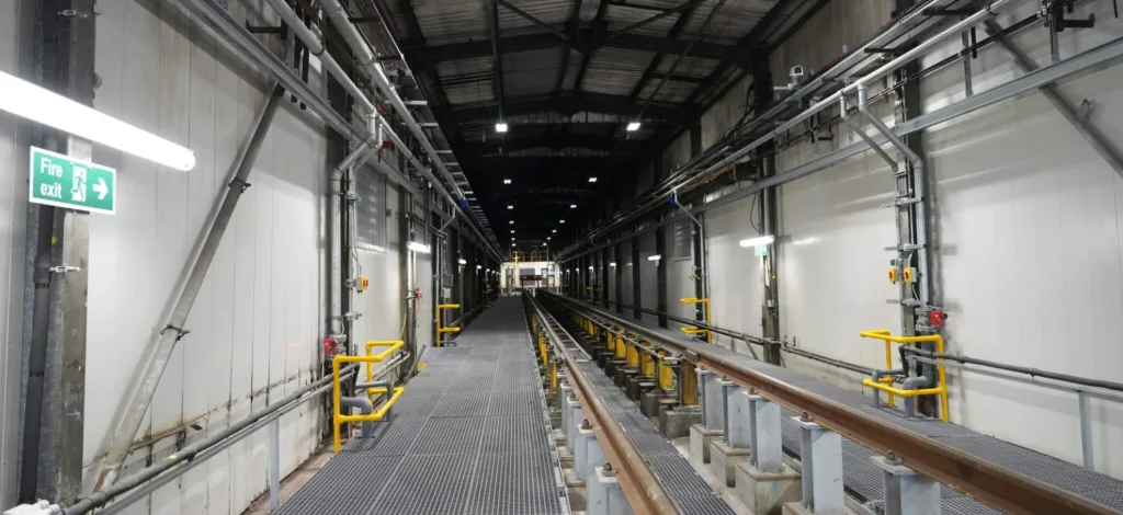 Works Package 5 is the most extensive of all the packages and will involve a 100m extension to the existing depot building, providing four car stabling of trains on two roads, numbers 11 and 12. This package includes new pits to both roads 11 and 12, along with all the mechanical and electrical services.