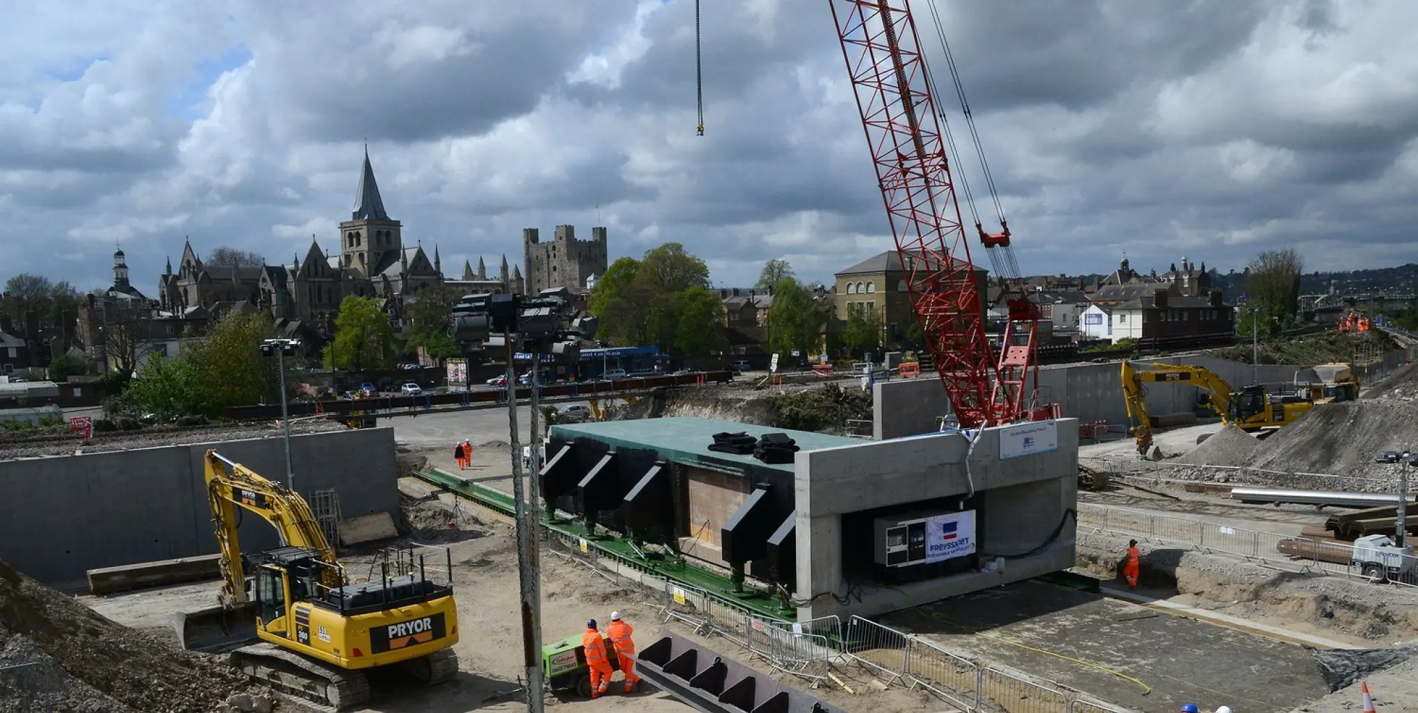 One of the biggest challenges on this project was the installation of the new subway at Rochester. The 850T, 28m long, 7.6m wide and 4.0m high subway was slid 36m into place on a bed of nitrogen gas during a 96 hour Easter blockade, This method (building the subway off line and adjacent to the embankment before sliding it into place) was used to minimise interruption to the network, and it was the first time this specialist technique was employed in the UK.