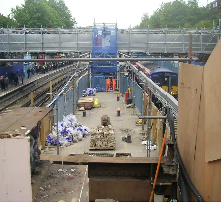 Spencer Rail Engineering installed three new liftshafts with 16 person lifts, expanded the concourse area, built new ticket gates, installed new telecoms, CCTV, PA and CIS monitors and installed new toilets. To maintain access to all platforms during the installation of the three new lifts, a temporary footbridge had to be installed manually. This involved ‘hand-balling’ 80 tonnes of scaffolding via the pedestrian entrance at night, and removing more than 100 tonnes of soil by hand, due to the severely limited construction access and impossibility of using heavy machinery – Putney station being surrounded by residential properties. The new concourse was designed as a spacious area spanning all tracks and platforms, to alleviate congestion at the gate-line.